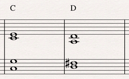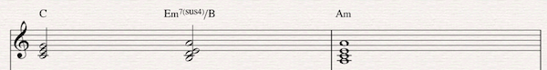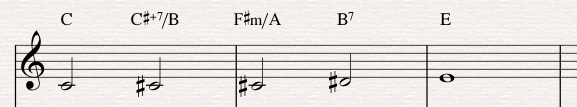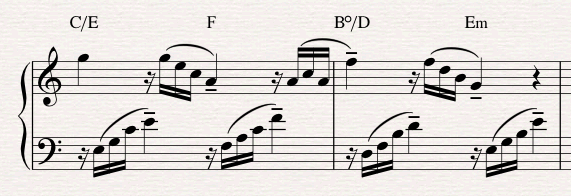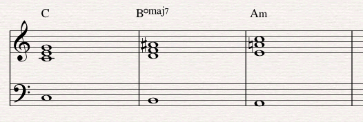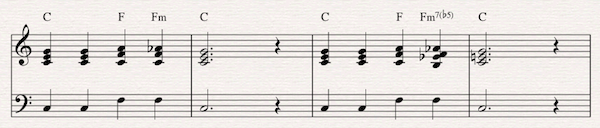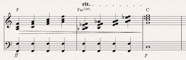 Notice that every pitch from the Fm7b5 resolves by a half step to a pitch from the C triad. This can be thought of as a variation of, or alteration to, the whimsical I – IV – iv – I progression that is somewhat common to pop styles: