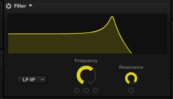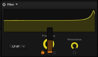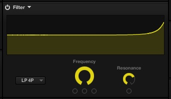 Your noise oscillator should now play back in the same way as the saw wave in the initial patch, with an on/off type effect. We are now ready to add some resonance to the sound using the synth’s filter section. I have chosen a low pass filter model as this is what we will be using to create the downwards sweep. I have then turned the resonance up to nearly full. I haven’t gone all the way due to the fact some filters will ‘self-resonate’ at very high settings and in effect become their own oscillator, masking any other sound source used. I wanted to hear the noise really come through in this patch, so I held the level back a little.