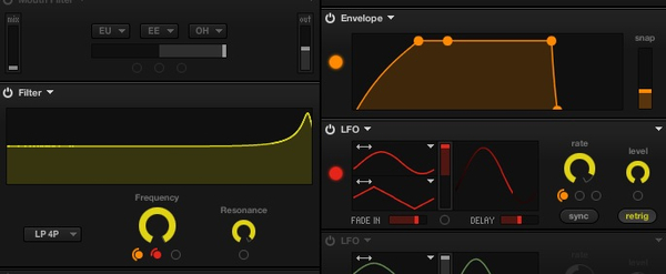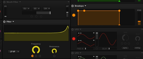 To add some extra movement and interest to the sound we can use LFOs to modulate any part of the sound we like. Here I have used one LFO to control the cut off frequency as the envelope sweeps it. The result is a wobbling effect as the frequency drops.
