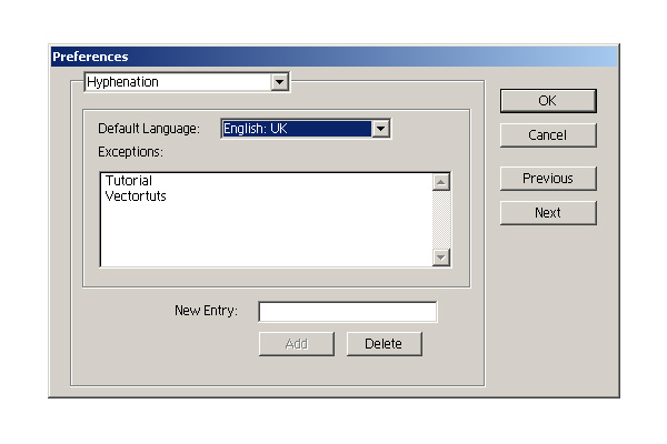 Go to Illustrator > Preferences > Hyphenation. Just as explained under The Paragraph Panel this determines the base language of your text for hyphenation purposes. Exceptions are also allowed, which won’t be hyphenated when text wrapping is needed. In this example, Vectortuts and Tutorial are made exempt from hyphenation.