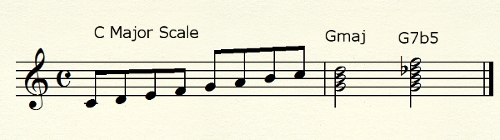The 5th scale degree of the C Major scale is a G. If we were to play an G7b5 in the key of C major we would have to flatten the 5th, a D in this case, and replace it with a Db. Notice, how the G is the 5th of the key and D is the 5th of the chord? If you are still having issues visualizing this concept here is a written out example…