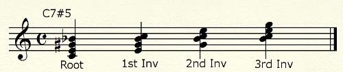 As we have discussed in the previous articles, an inversion is simply a reorganizing of the notes of a chord so that the root is no longer in the bottom of the chord. Which note is in the bottom of the chord will then determine which inversion of the chord we are using. Since Alt Dom chords have 4 notes, we can only have 4 different voicings, root position, 1st inversion, 2nd inversion, and 3rd inversion. So if a C7#5 has the notes C,E,G#,Bb in root position, then E,G#,Bb,C will give us a 1st inversion. Finally we will have G#,Bb,C,E for 2nd inversion and Bb,C,E,G# for our 3rd inversion.