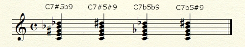 In order to effectively use a Alt Dom chord we first need to understand what exactly a Alt Dom chord is. An Alt Dom chord is simply a dominant chord (centered around the 5th of the key) but with a minor 7th on top (hereby creating a Dominant 7th) and the 5th and 9th of the chord either lowered or raised by one half step. This in turn gives us either a b5 or a #5 instead of a natural 5 as well as a b9 and #9.