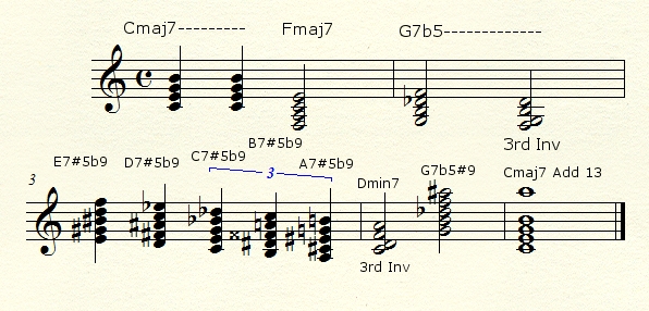 What is nice about Dominant chords is that unlike the chords in the previous tutorials, the inversions do not imply different types of similar chords. With the Sus chords we could shift around which chord and Sus we were using, Alt Dom chords cannot do this. While you theoretically could come up crazy names like a Emaj#4#5 for a first inversion C7#5, you really are not implying any other chord other than an Alt Dom chord.