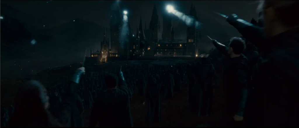 For many of the scenes in these movies, partial sets and then digital sets were created. This film wanted to show more destruction shots and extensive battle sequences so they decided not to use any more miniatures because with CG Imagery they were able to create more rigid body dynamics and destruction work. The castle in the earlier movies was actually a miniature and so they had rebuilt the entire castle and were able to handle new concepts and ideas. They also rebuilt the set for Godric’s Hallow in CG and almost the entire scene is full of CG environments and CG snow.