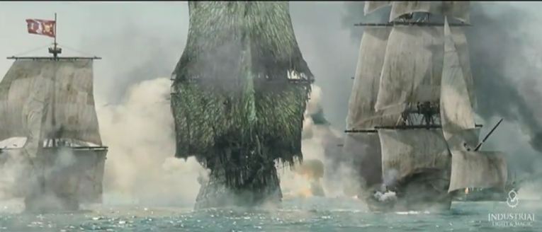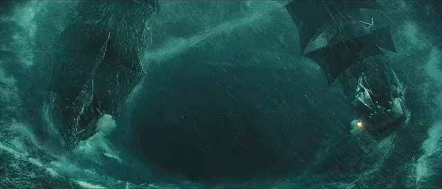 This movie has more than 1000 VFX shots including waterfall sequences, icebergs, ship destruction, CG Creatures, and so on. Many of these shots have live action elements combined with CGI, except for the Maelstrom whirlpool which is a total 3D Environment. The ships were live action boats extended and sometimes full CG Ships so they had both live water action and CG water simulations. There is a scene where the ship is descending below the water; for this scene water passes were filmed and tracked and then were combined with CGI elements and the motion captured crew.