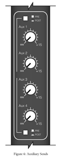 In the signal path, the auxiliary send usually comes after the insert point and before the equalizer. On the channel strip it will be controlled by a knob or fader usually marked “Aux” or “Aux Send” (see Fig. 6). The mixer will also have an output to match each aux send. Each auxilary send will be accessible on every