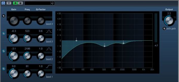 I’ve used the Cubase ‘studio EQ’ here as we want this EQ to be next in our effects chain, rather than after it which is where the Cubase channel EQ sits. I’ve made cuts at about 500 Hz and 2 kHz, as well as rolling off the sub bass from about 60 Hz – in this before and after you can hear how these cuts have removed some of the harsher and muddy tones from the sound.