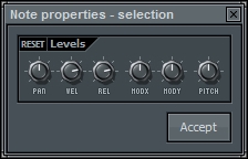 - Do you prefer to use knobs to adjust velocity and pan instead of the auxiliary window below? Simply double click a note to bring up a Note Properties window which shows all the information about that note as a series of knobs.