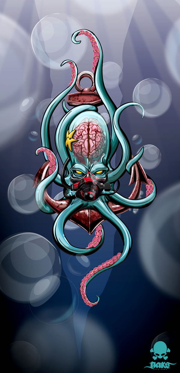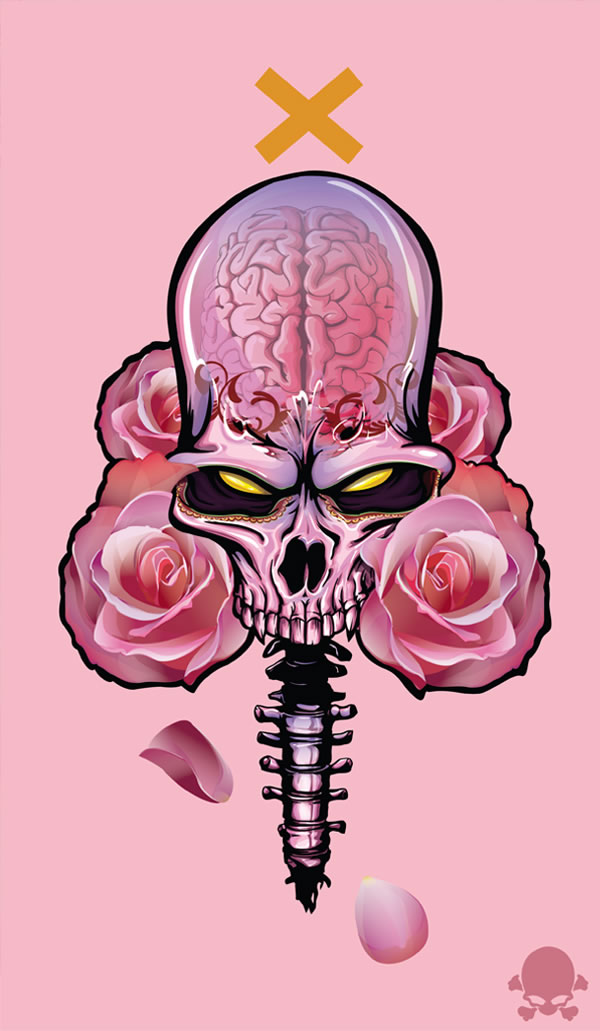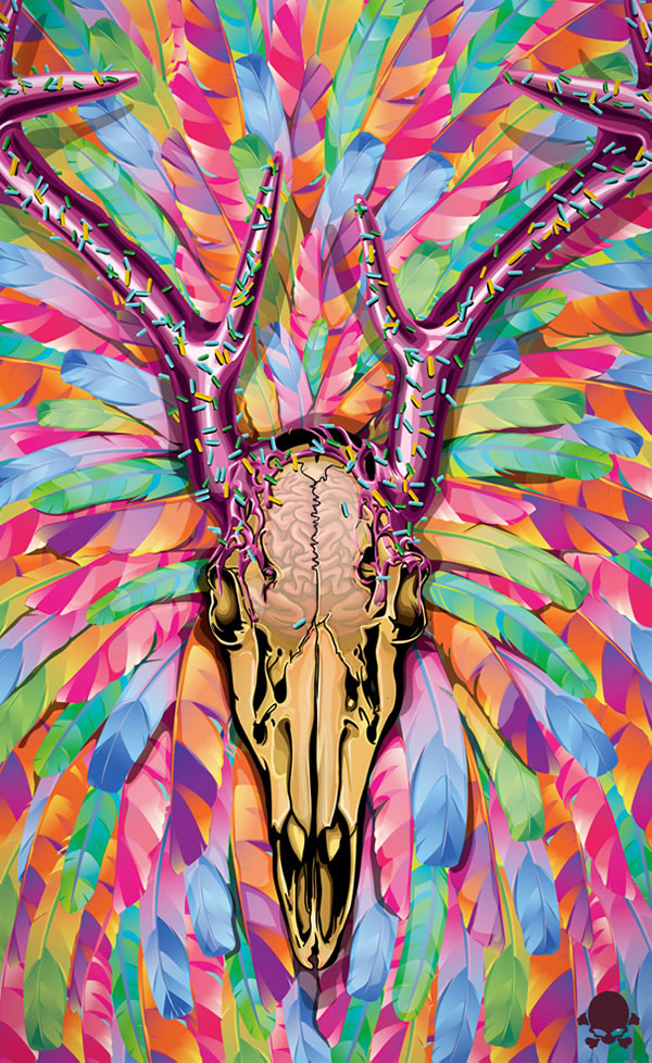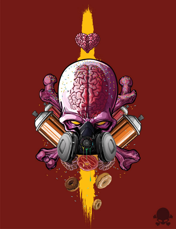 The Candy King is a personal favorite of mine; it served as a passage of sorts from my old style to new. It was my attempt to combine the graffiti aesthetic with the cheer and playfulness of a candy visual. All of my illustrations start as rough concepts on paper at first, and then they’re scanned and fleshed out in Illustrator. The second step would be to establish the primary line-art. Then I move on to the more time consuming aspect of any of my illustrations – the coloring. I start with a base color located right beneath the line-art and build upon that. Usually I work on a particular element of the illustration on its own, I treat it as a stand-alone illustration and then integrate it with the final image. For example, The Candy King’s gas mask was a project all on its own. When each element is completed I put them into place and work on blending all the elements together to look like one cohesive piece of work.