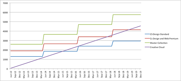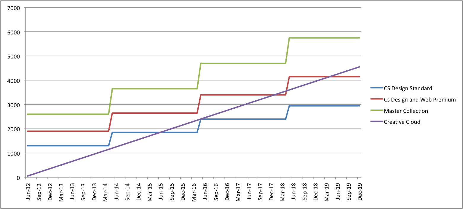 So what does this mean in real numbers? It means that after 7.5 years, a Creative Cloud customer will have spent $1,603 more than a CS Design Standard Customer, and $403 more than CS Design and Web Premium customers. A traditional license is usually a better deal, unless you need everything included in the Master Collection.