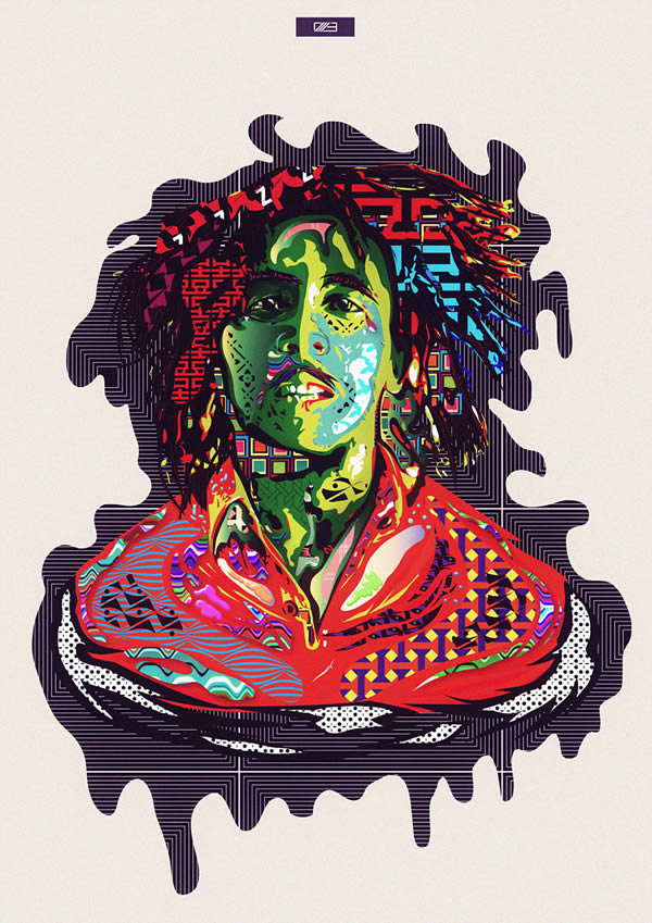 Oh yes, Marley was a special one. The portrait of Bob was the initial start of a total of 3 portraits I’ve done for Slashthree’s Quote/Unquote. The idea was there way before but without the skillset to execute it. To get it similar I’ve taken a popular image of Bob Marley as a reference, drawing shapes on top of him to get everything right. Sadly his right eye was covered in black so I had to freestyle on that part. When I got a raw version of him I started adding various smaller shapes to the inside, all of them being patterns, colors or gradients. I was going for a funky feel in the whole piece so the more colors I added, the better it got. I also used a lot of adjustment layers to correct colors, bring them out much more and to help the background a bit being less boring. I’m not exactly sure how I came up with the stylistic approach of it but I was upset at that time that I couldn’t do portrait work like other artists do and had enough ideas but no motivation to try it out. One day I just did and the results are pretty impressive, to me at least. I was really surprised that it turned out like I wanted it to be. I must also credit the help I received from my friends at Slashthree.