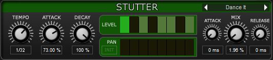 Stutter is a gate effect which silences the the sequence time to time to create a trance gate effect. On the device control section you can find a pattern creator for the Stutter.