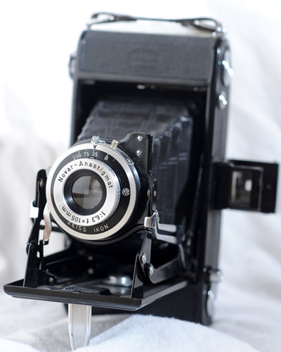 For used cameras, look for all those brands plus Zeiss, Yashica, Bronica and Moskva. Of course, there are also the inexpensive Dianas and Holgas as well. KEH, B&H, Adorama and Lomography are all good places to start looking for both new and used cameras of all types. The camera pictured below is a Zeiss Nettar 515-2 folder. It created huge negatives and can be obtained quite cheaply.