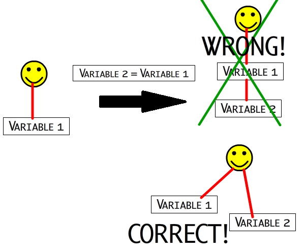 The image assumes both Variable 1 and Variable 2 can hold the smiley (i.e. they can hold the same type). In the left side, only Variable 1 exists. However, when we create and set Variable 2 to the same value of Variable 1, we are not creating a link between Variable 1 and Variable 2 (top-right part of the image), instead we are creating a link between the Smiley and Variable 2 (bottom-right part of the image).
