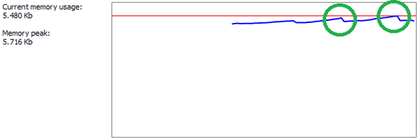In the image, you can see the memory peaks (circled in green). The peaks and the sudden drop are caused by the garbage collector, which acts when the application has reached the requested memory usage (the red line), removing all unnecessary objects.
