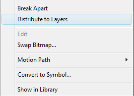 Select the movie clip on frame 1. Right-click and distribute to layers. Again, do it to all movie clips on all frames. When you’re finished you will no longer be able to see the animation, only the image on the top layer.