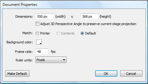 Open a new document in Flash and set up the size to 550×368 so it matches our background image. Set the frame rate to 48fps. The displacement filter is actually going to run at 12fps, but in case you want additional animation later on it would look smoother at 48fps.