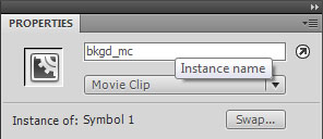 If the properties window is closed, press Ctrl + F3 to open it. We are going name the movie clip that was just created. On the instance name field, type “bkgd_mc”.