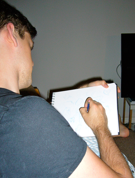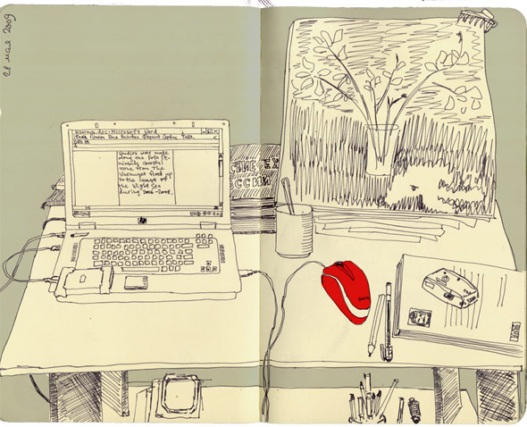 They come in all shapes and sizes, different weights of paper, different qualities and different bindings -it may seem trivial to the uninitiated, but getting the sketchbook that’s right for you is really important. Personally I like to work with a landscape, A4 hardcover, spiral bound notepad. I like the fact that the spiral binding means I can draw to the very edges of the paper and the gutter doesn’t get in the way, and the landscape orientation feels most comfortable on my lap. As with anything, like your office chair or desk, it’s important to have a comfortable working environment.