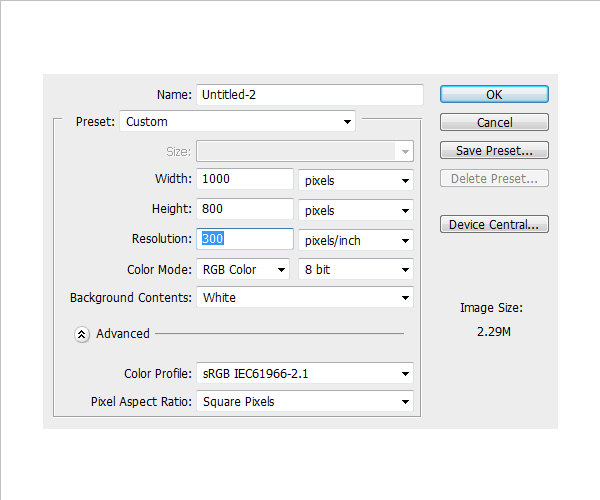Let’s start this project by creating a new file 1000 x 800 px with a resolution of 300 ppi.