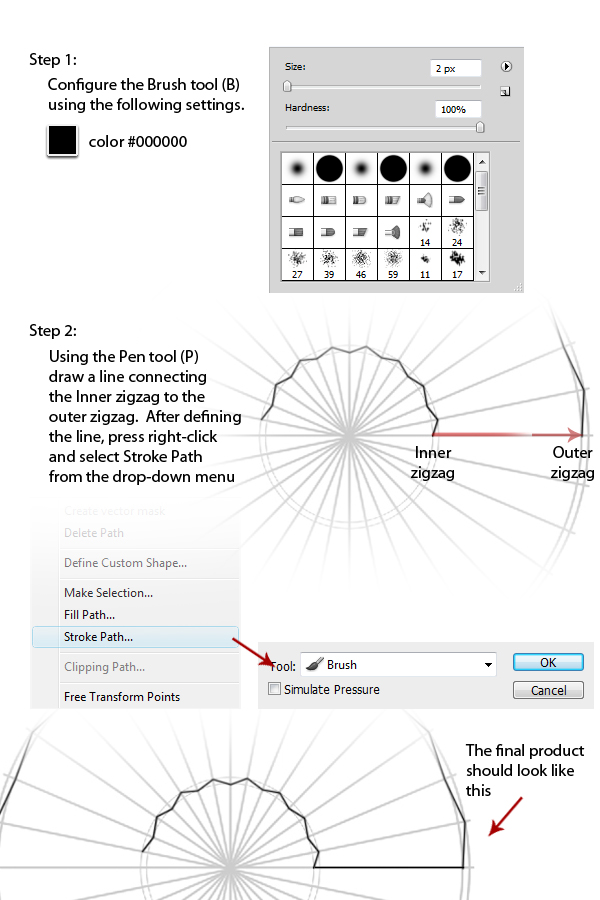 When you’ve reached the 16th point, right-click and select Stroke Path from the drop-down menu. Prior to this, make sure to configure the Brush tool (B) to a Master Diameter of 2px, Hardness of 100%, Color #000000 and Opacity level of 100%.