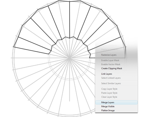After connecting all the "down" portions of the zigzag, including the 16th point from the 0 degrees, press Cmd (Ctrl) then left-click the layers comprising all the lines and select Merge Layers from the drop-down menu. After that rename the merged layer as "Black lines."