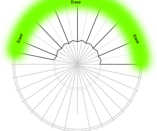 On the "White lines" layer, use the Eraser tool (E), configured to a Size of 100px and a Hardness of 0%, to erase the indicated areas as shown below.
