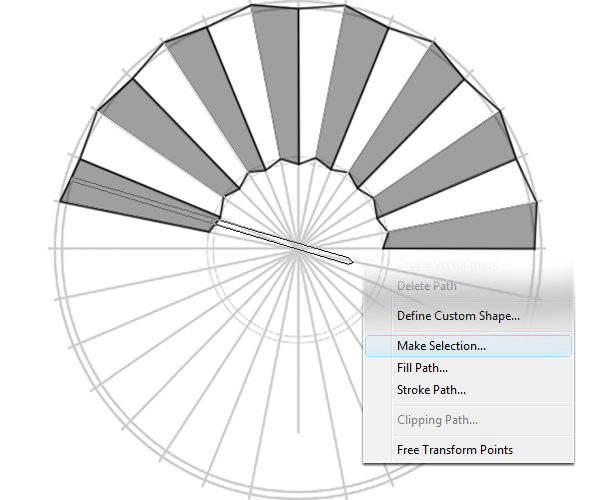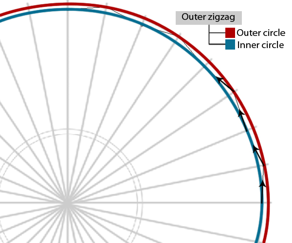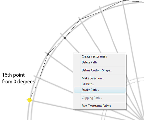 Next add a new layer and name it "Outer zigzag." Using the Pen tool (P), draw a path alternating from the inner circle going to the outer circle and back again to the inner circle until you’ve reached the 16th point from the 0 degree angle like as shown.