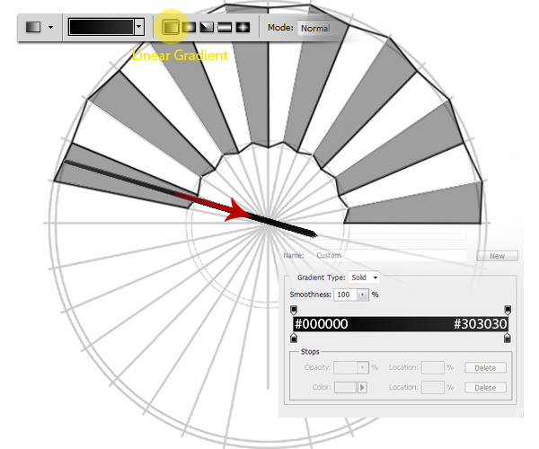 Next, Cmd (Ctrl) + click the thumbnail on the "Circle" layer to activate the selection marquee around the shape. Apply a color gradient using the Gradient tool (G), set to Linear Gradient, using the color numbers indicated below.