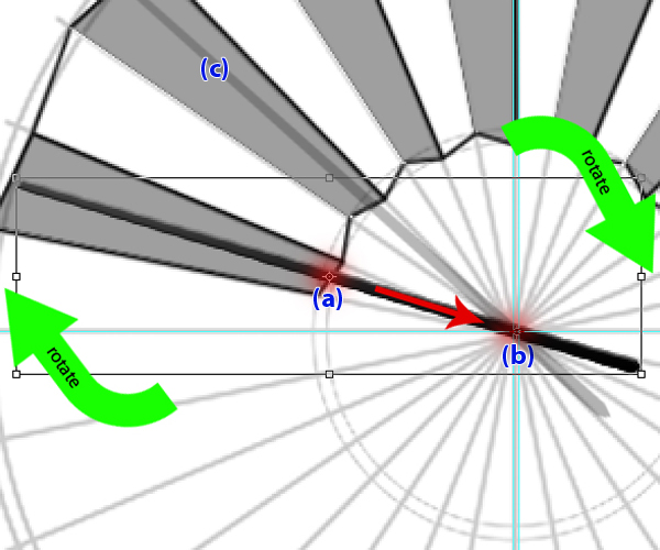 Next duplicate the "Sticks" layer then hit Cmd (Ctrl) + T to activate the resizing handles. Reposition the center of rotation axis (a) to the center point of the fan (b) then rotate it to the next shade (c).