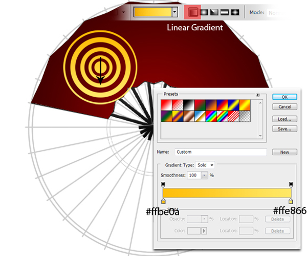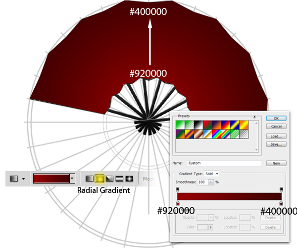 Next, use the Gradient tool (G), set to Radial Gradient, to fill the entire selection with colors shown below.
