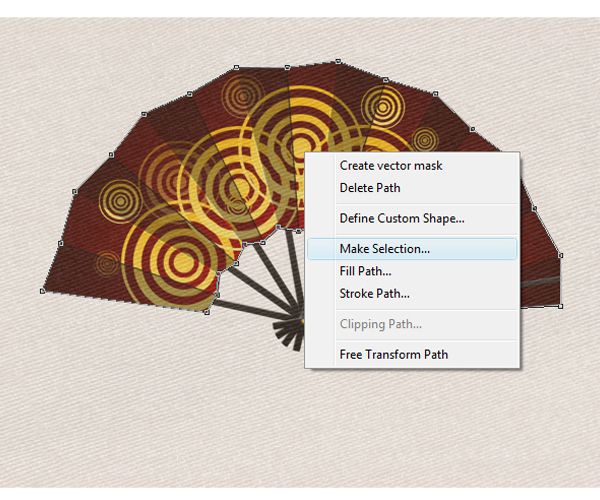 Open Fabric.jpg and drag it into our project. For the time-being, decrease its opacity to about 50% so that you can see the "Face" pattern underneath. Next, use the Pen tool (P) and follow the shape of the "Face" of the fan as shown below. Right-click and select Make Selection from the drop-down menu. Hold Cmd (Ctrl) + Shift + I to inverse the selection then hit delete. After that, increase the opacity level back to 100%. Rename this layer "Fabric" then change its Blending mode to Overlay.