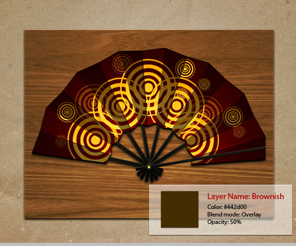 Add a new layer and name it "Brownish." Using the Paint Bucket tool (G), fill the entire layer with color #442d00, set the Blending mode to Overlay and Opacity to 50%.