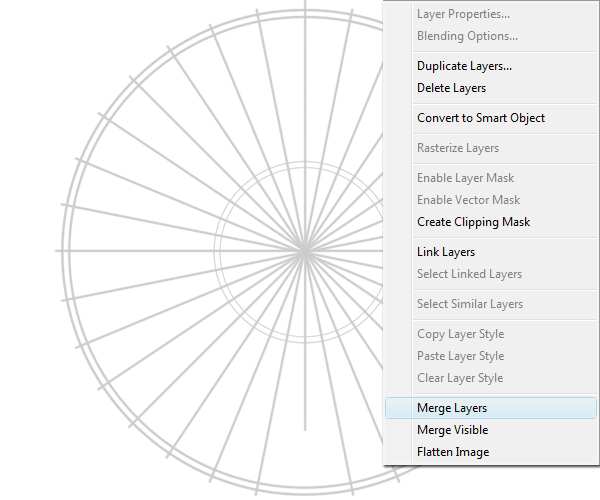 Merge the "Outer Circles," "Outer Circles copy" (duplicated layer of the "Outer Circles"), and the layers of all the lines by Cmd (Ctrl) + clicking the layers then right-clicking on it and selecting Merge Layers from the drop-down menu. Rename this layer as "Guidelines" and decrease its Opacity level to 50%.