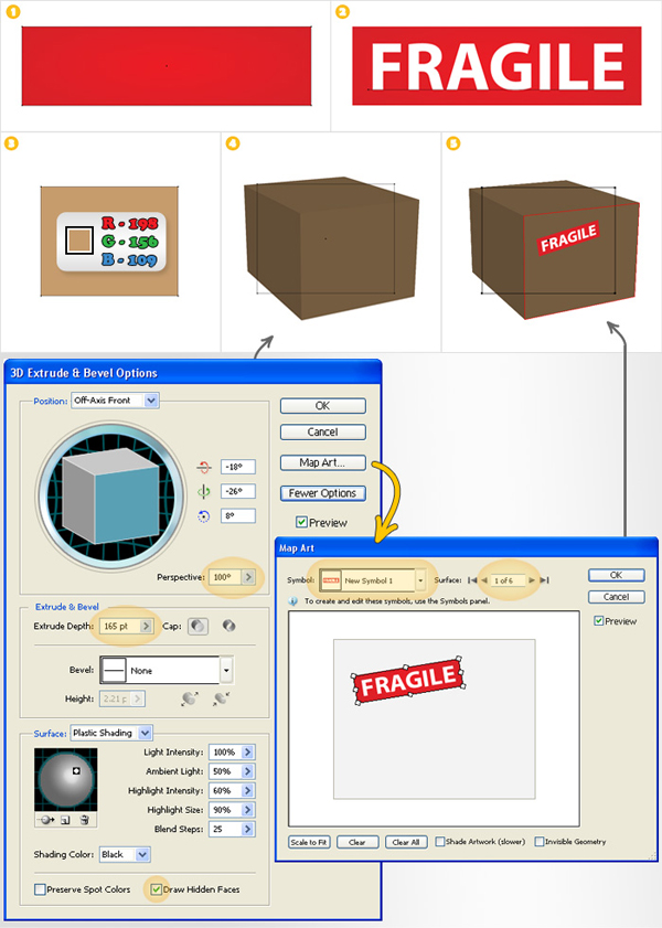 Let’s continue with the cardboard box. Reselect the Rectangle Tool (M), create a 140 x 111px rectangle and fill it with the color shown in image "3" then go to Effect > 3D > Extrude & Bevel. Follow the data shown in the following image. Pay attention to the highlighted sections. You will need to add the fragile label. Click on the Map Art button, go to"Surface 1" and select the “Fragile Label” from the Symbol drop down menu. Place it as shown in image "5" then click OK.