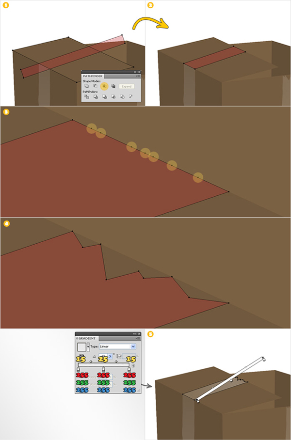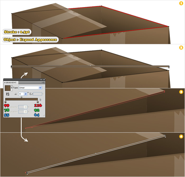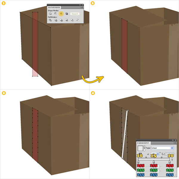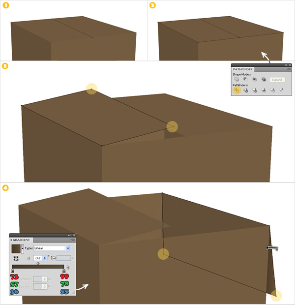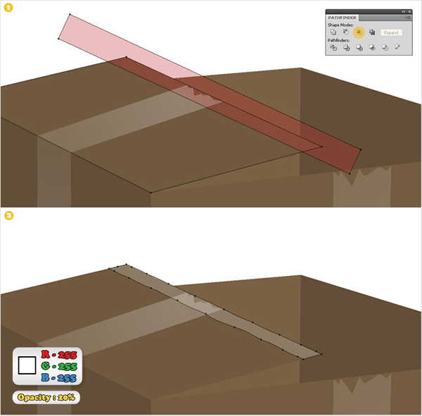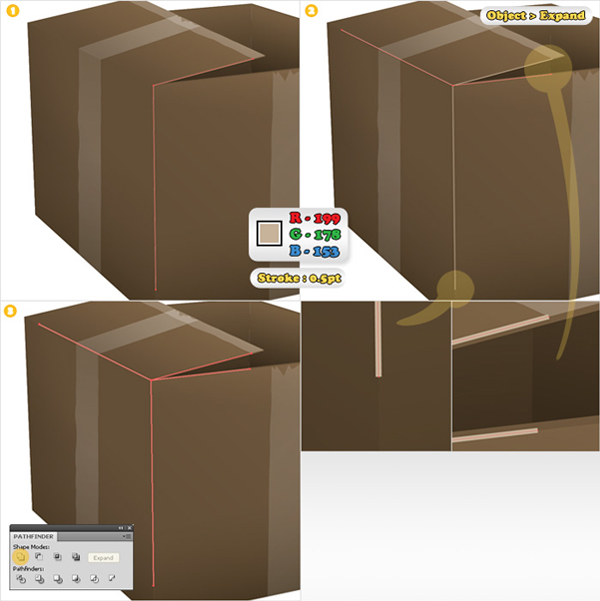 Using the Pen Tool (P) create two simple paths over the edges of the cardboard box (as shown in images "1" and "2"). Add a 0.5pt stroke (color R=199 G=178 B=153) to each of these shapes. Select both paths and go to Object > Expand. Select the resulting shapes and click on the Unite button from the Pathfinder panel.