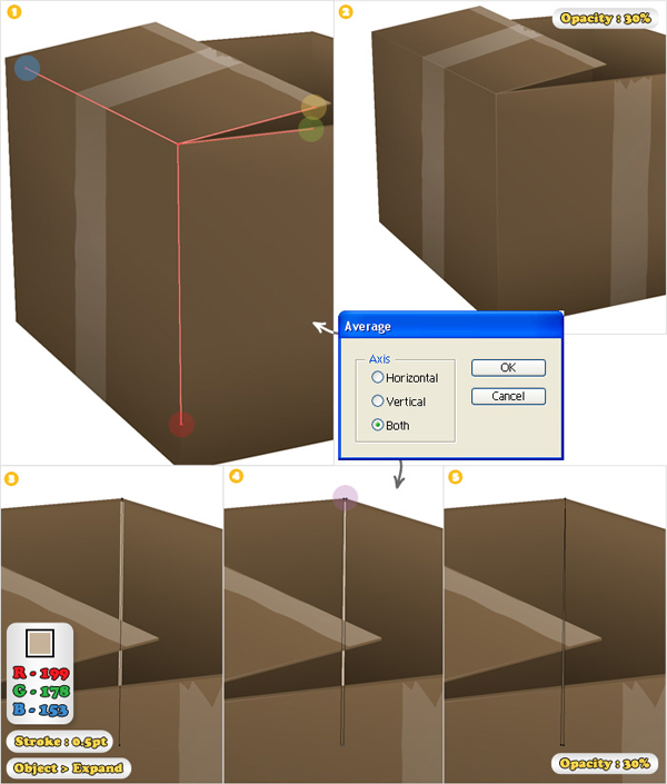 Select the anchor points highlighted with red and go to Object > Path > Average. Repeat this technique for the anchor points highlighted with yellow, green and blue. Lower the opacity of this shape to 30%. Create a vertical path like the one shown in image #1 using the Pen tool (P). Add a 0.5px stroke (color R=199 G=178 B=153). Select this stroke and go to Object > Expand. Select the top anchor points and go to Object > Path > Average. Lower the opacity of this shape to 30% then move it behind the front side of the cardboard box.