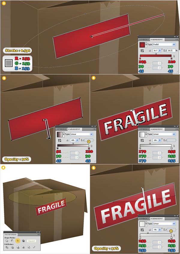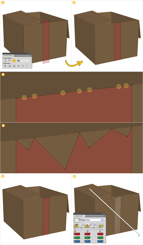 We will now make the Scotch tape. Create a copy of the front side of the cardboard box. Select the Rectangle Tool (M) and create a rectangle like the red one shown in image #1. Select both the tape and the front copy and click on the Intersect button from the Pathfinder panel. Zoom in on the top of the resulting shape, with the Add Anchor Point Tool (+) add some random anchor points (image "3"). Move some of these anchor points a few pixels down (image "4"). Reselect this shape then, with the Wrinkle Tool add a discrete effect for this shape. Double click on the Wrinkle Tool to change the settings. Finally, fill this shape with the gradient shown in image "6". Pay attention at the opacity of each gradient slider.