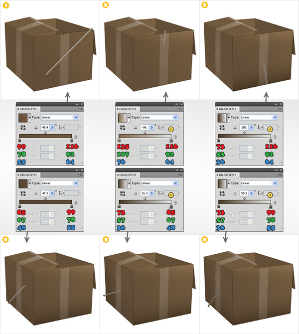 Select the front side of the box and fill it with the gradient shown in image "1". Next, add two new fills (from the flyout menu of the Appearance panel) and use the gradients shown below images "2" and "3". Select the left side of the box and fill it with the gradient shown above image "4". Add two new fills for this shape and use the gradients shown above images "5" and "6".