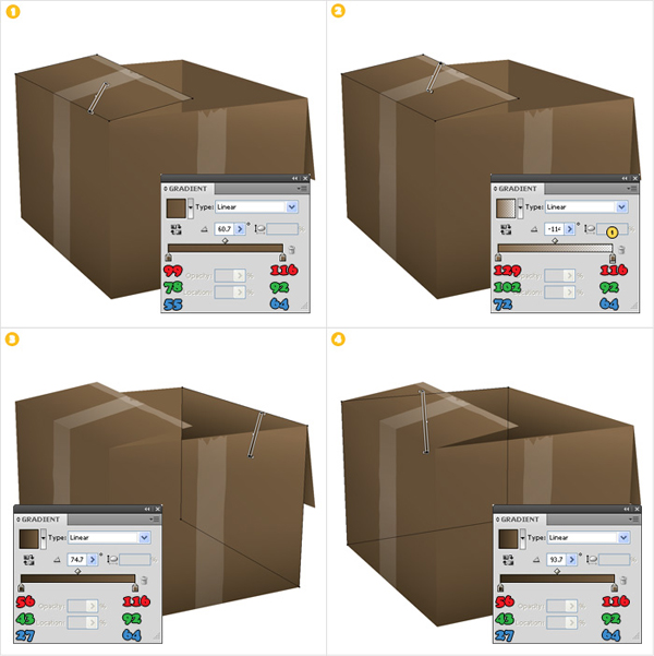 Select the top left shapes and fill them with the gradients shown in images "1" and "2". Continue with the interior of the box. Select these two shapes and fill them with the gradients shown in images "3" and "4".