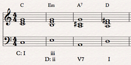 - Work backwards from A to find a chord that logically precedes it but also belongs to the first key. In this key Em makes sense before A7 because it would make a ii-V-I progression in D. And Em is also the iii chord in C, thus it makes sense in both contexts.