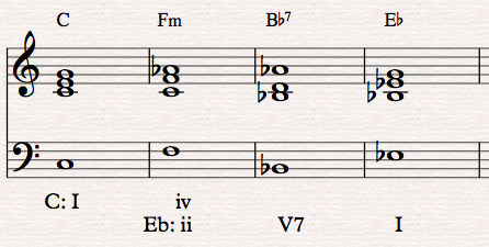 In the first key you simply use iv in place of IV. We could modulate from C major to Eb major with the progression C – Fm – Bb7 – Eb. The Fm begins life as minor sub-dominant in C, but then we reinterpret that to be the ii chord in Eb.