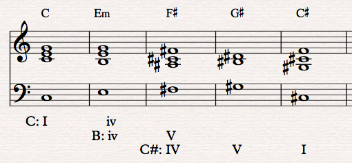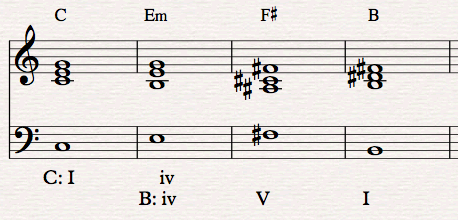 Or we could modulate from C major to B major with the progression C – Em – F# – B. The Em appears as iii in C major, but we reinterpret it as the minor sub-dominant iv in the key of B.