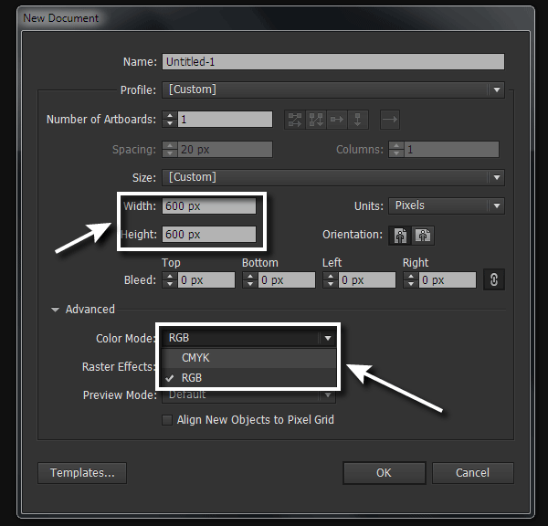 Run Adobe Illustrator, then hit Control-N to create a new document. In the opened dialog box, set the parameters of the artboard and choose the color mode depending on how you want to use your created image. If you’re planning to print your artwork choose the CMYK color mode and if you only want to publish your artwork on the web then choose the RGB color mode.