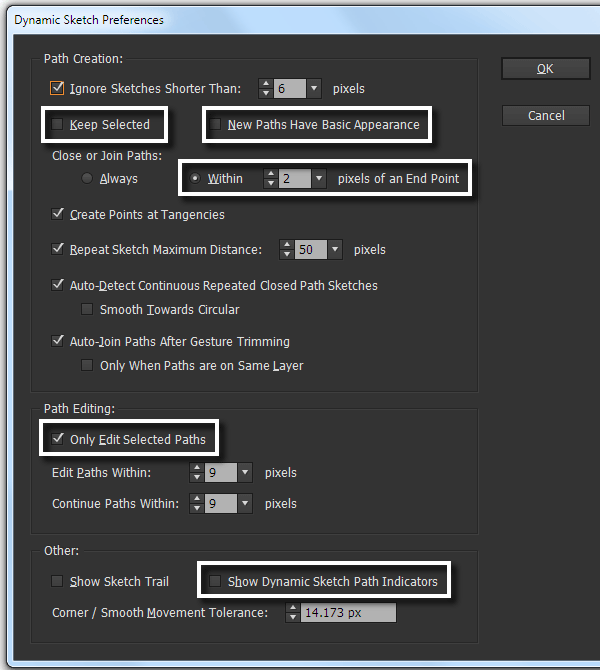 To open the DynamicSketch Preferences dialog box, double-click on the tool’s icon, or press the Return/Enter key after choosing the tool. To create a sketch, I use slightly different settings from the default ones. You can see these in the image below.
