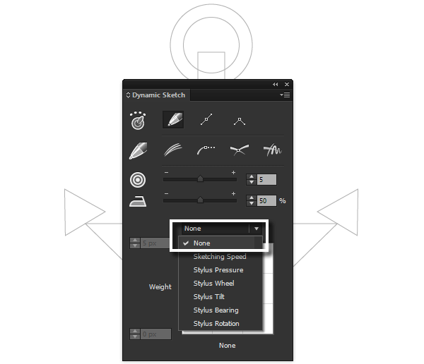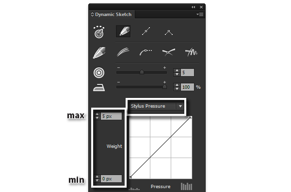 If you’re using a graphic tablet in your work, you’ll need to set the relationship between the stroke width and the pressure of the stylus. If you use a mouse for drawing, then you need to set the relationship between the stroke width and the cursor speed (Sketching speed). By the way, none of the standard tools in Adobe Illustrator possesses such a feature. You can also set the minimum and maximum stroke width to correspond to the stylus pressure or cursor speed.