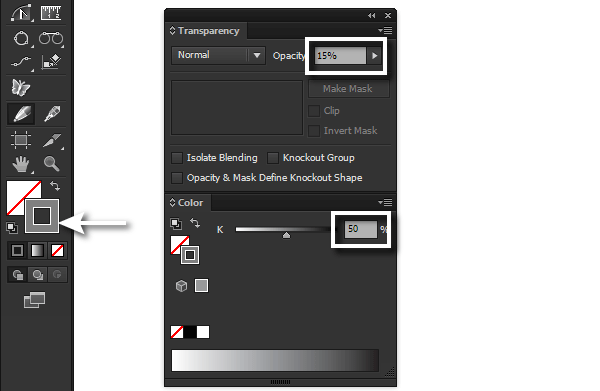 Select all the created objects and group them up (Control-G). Reduce the opacity of the entire group in the Transparency panel. If necessary, reduce the stroke thickness in the Stroke panel. We’ll use these created shapes as a template.