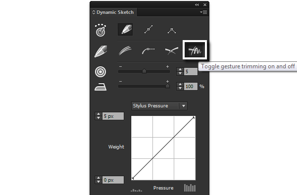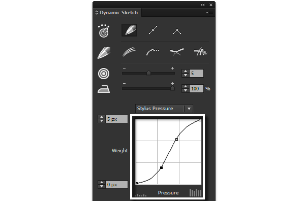 At the bottom of the Dynamic Sketch panel, you can see a diagram of the dependence of the stroke width to the change in the selected parameter. By default, this diagram shows a linear relationship, but you can edit it (add points, move, bend, etc.), to set up the tool to work how you want it to.