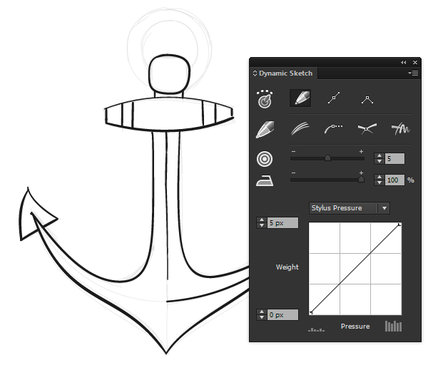 I draw using a graphic tablet, so I’ve chosen Stylus Pressure and linear relationship in the panel. Create the outline of an anchor, based on the sketch, as shown below.